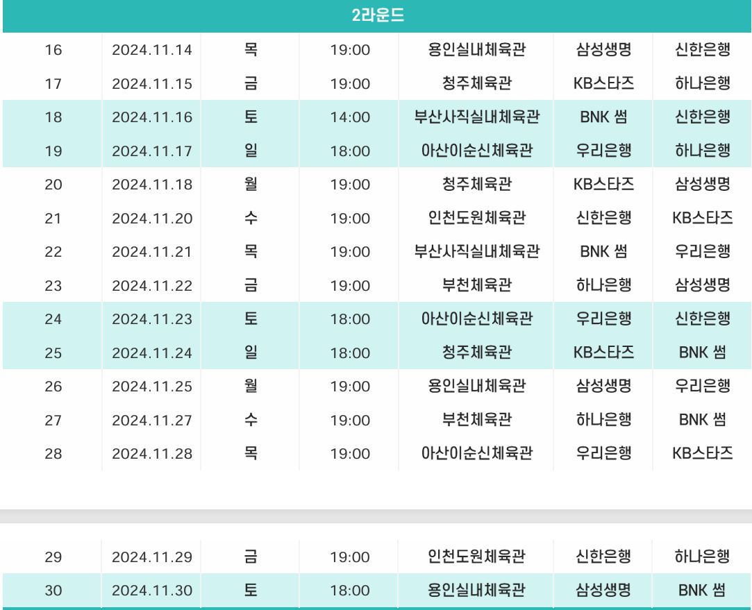 주말인 11월 1일(금)에는 용인 실내체육관에서 삼성생명과 하나은행 경기가 있으며 MBC 스포츠플러스 채널에서 생중계 예정입니다. 2일(토) 아산 이순신체육관의 우리은행과 BNK썸 경기는 KBS N 스포츠와 MBC 스포츠플러스 채널, 3일(일) 하나은행과 신한은행 부천 경기는 MBC 스포츠플러스와 스카이스포츠 채널 중계 예정입니다.