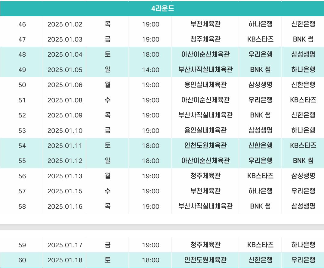24-25 시즌 개막전은 10월 27일 부천체육관에서 열렸습니다. 지난 시즌 정규리그 우승팀인 KB스타즈가 하나은행을 상대로 64 대 56 으로 승리를 거두었습니다. 두 번째 경기는 10월 28일 인천 도원체육관어서 펼쳐진 신한은행과 지난 시즌 챔피언결정전 우승팀인 우리은행 간의 경기였습니다. 오프 시즌 동안 전력 누출이 많았던 우리은행이지만, 김단비 선수가 34득점을 기록하면서 76 대 64로 승리하였습니다.